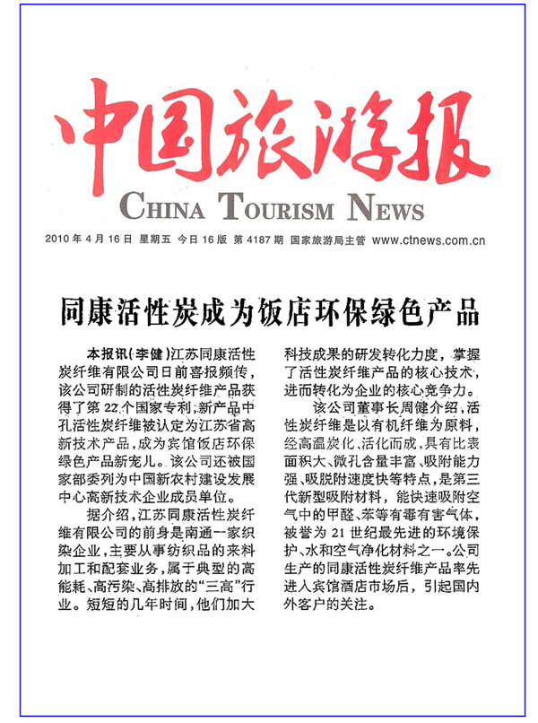 中國旅游報——同康活性碳成為飯店環保綠色產品